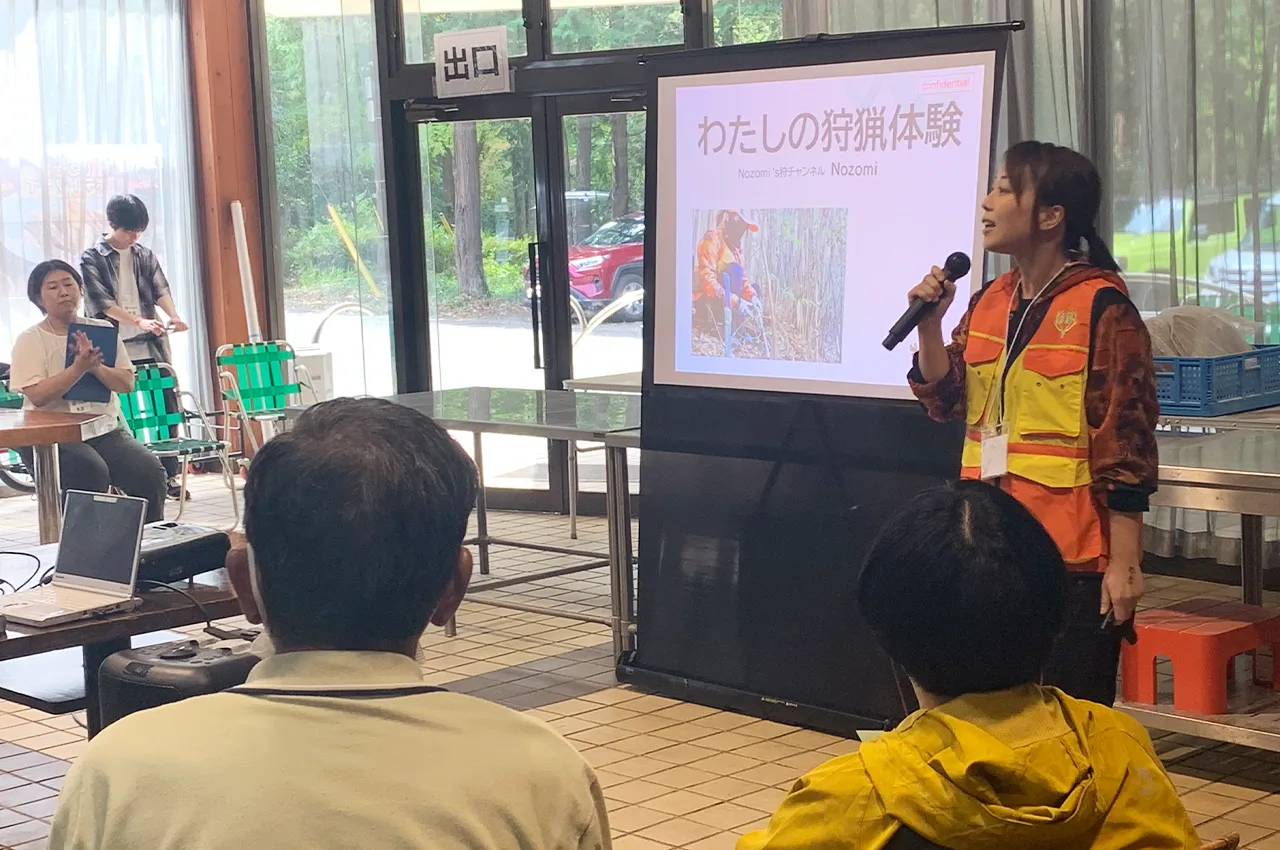 狩猟を始めたきっかけや現在の狩猟の状況、これまでの体験談など、実体験に基づいたお話をしていただき、参加者の皆さんも熱心に耳を傾けていました。講師:Nozomi 氏