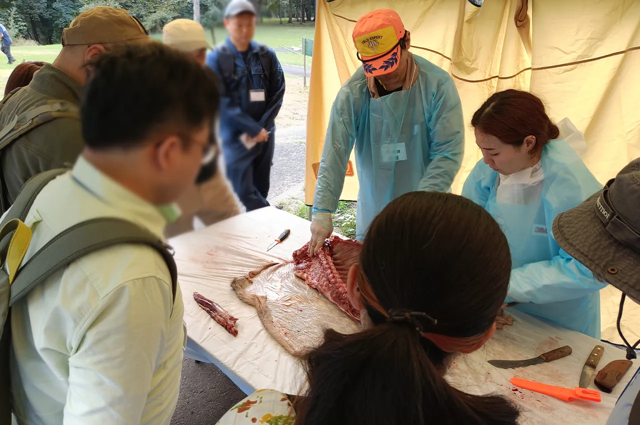 狩猟において欠かせない工程である、イノシシの皮剥ぎや解体の様子を見学しました。実際の手順を間近で確認することで、捕獲後の処理に必要な技術や流れを学ぶことができました。