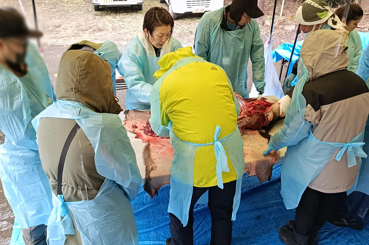 イノシシの解体に欠かせない皮剥ぎや部位ごとの解体作業を体験しました。